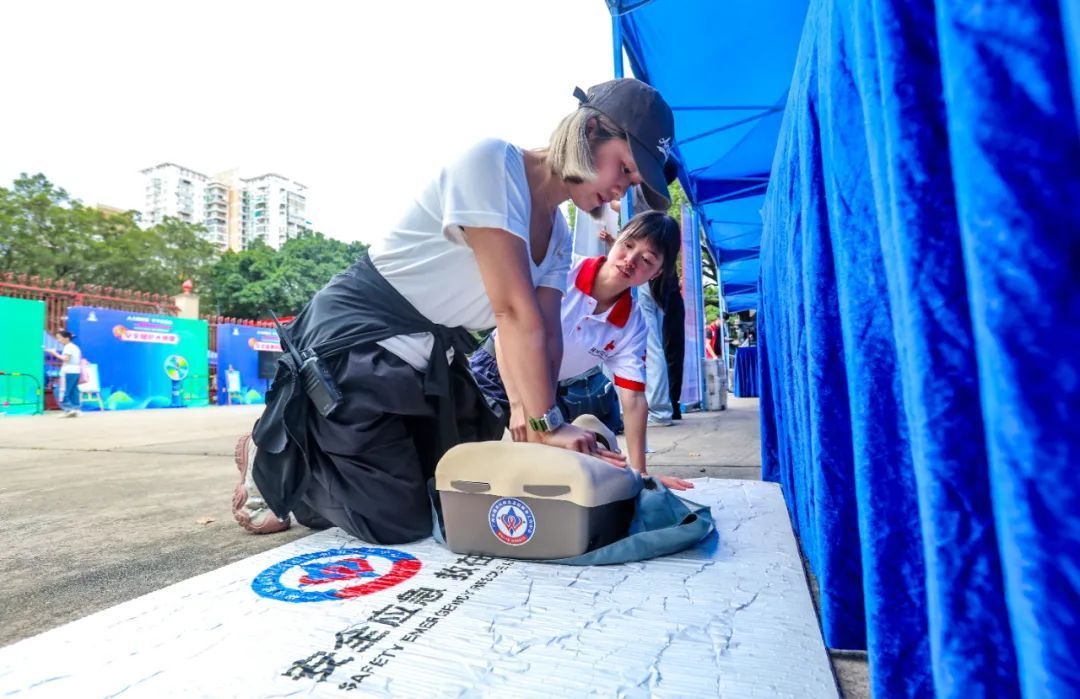 在应急装备展示区,市民在红十字会工作人员指导下,认真练习心肺复苏术。旁边的科技装备展台前,工作人员正向参观者介绍一台轻巧的无人机:“这是我们的救援无人机,能自动避开障碍物,还能把高清画面实时传回指挥中心,帮助救援人员快速了解现场情况。”